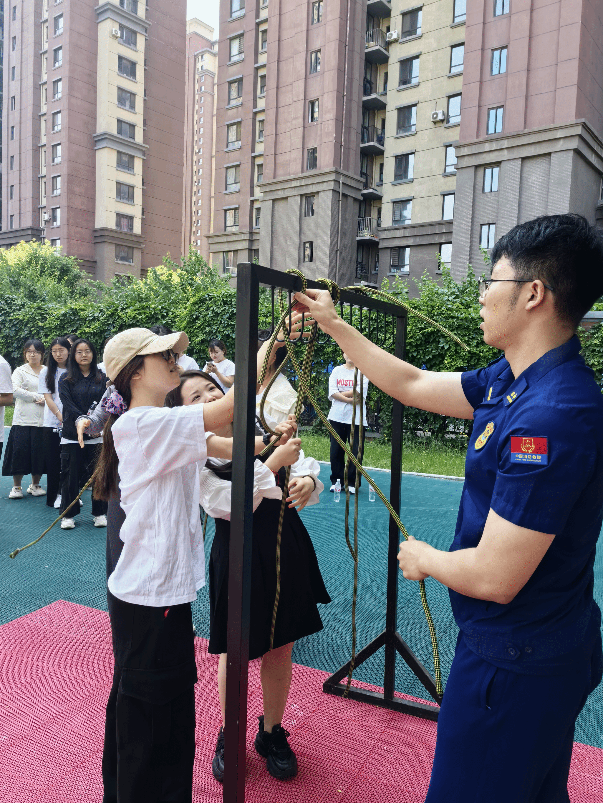 随后,师生们观摩了消防员的日常训练科目,包括高压水枪操作、高空索降等。消防员敏捷的身手和默契的配合赢得了阵阵掌声,也让员工们对“逆行者”的职业精神有了更深刻的理解。为提升师生应急处置能力,消防员重点讲解了灭火器的使用方法及逃生绳的系法。通过“一提、二拔、三握、四压”的口诀,员工们快速掌握了干粉灭火器的操作要领,并在消防员的指导下进行了灭火实操演练。在逃生绳教学环节,消防员演示了“双平结”“渔人结”等实用绳结的打法,并逐一纠正员工的操作细节。一名员工感慨道:“以前只在课本上学过这些知识,今天亲手操作后才发现,应急技能必须反复练习才能熟练运用。”